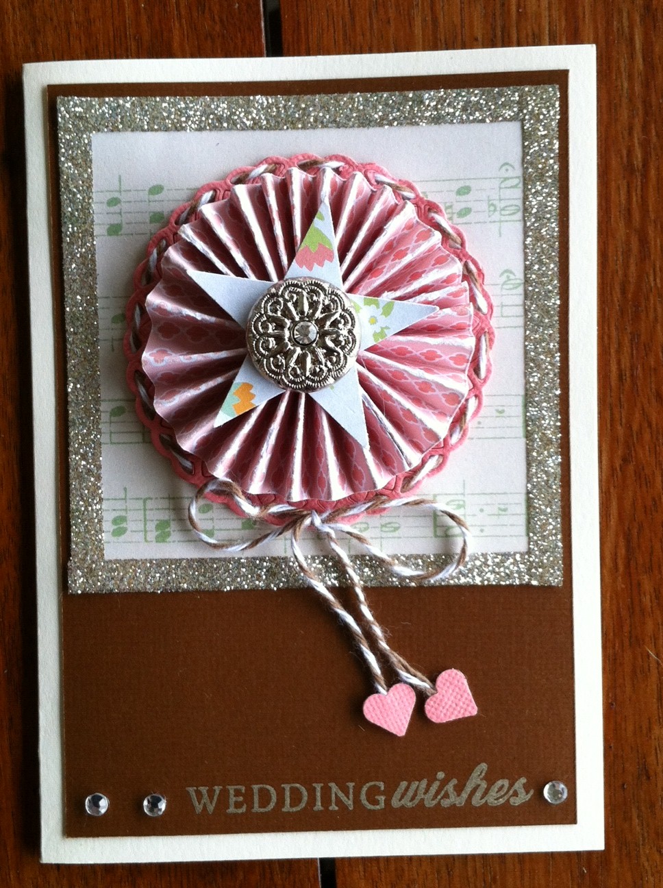 Make a square base from white cardstock. Using a sunburst template (you can find one at splitcoaststampers.com) cut sunburst wedges from various paper. Adhere to the card front, and then apply liquid glue (glossy accents works great!) to the join lines of the patterned papers. Cut lengths of yellow and white twine and adhere along the glue lines.